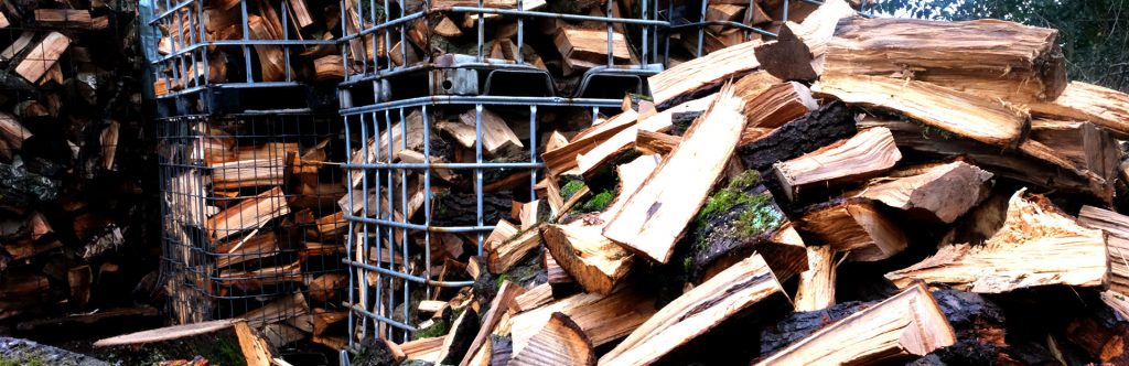 Wir sägen das Holz auf ca. 33cm. Das gespaltene Holz wird in Boxen geschüttet und draußen gelagert. Nach etwa 2 Jahren kann es als Brennholz verkauft werden.